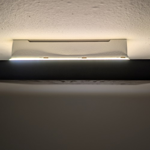 Un caisson en bois médium peint en blanc mat au rouleau permet de fixer le luminaire discrètement tout en masquant l'électronique et le câblage.